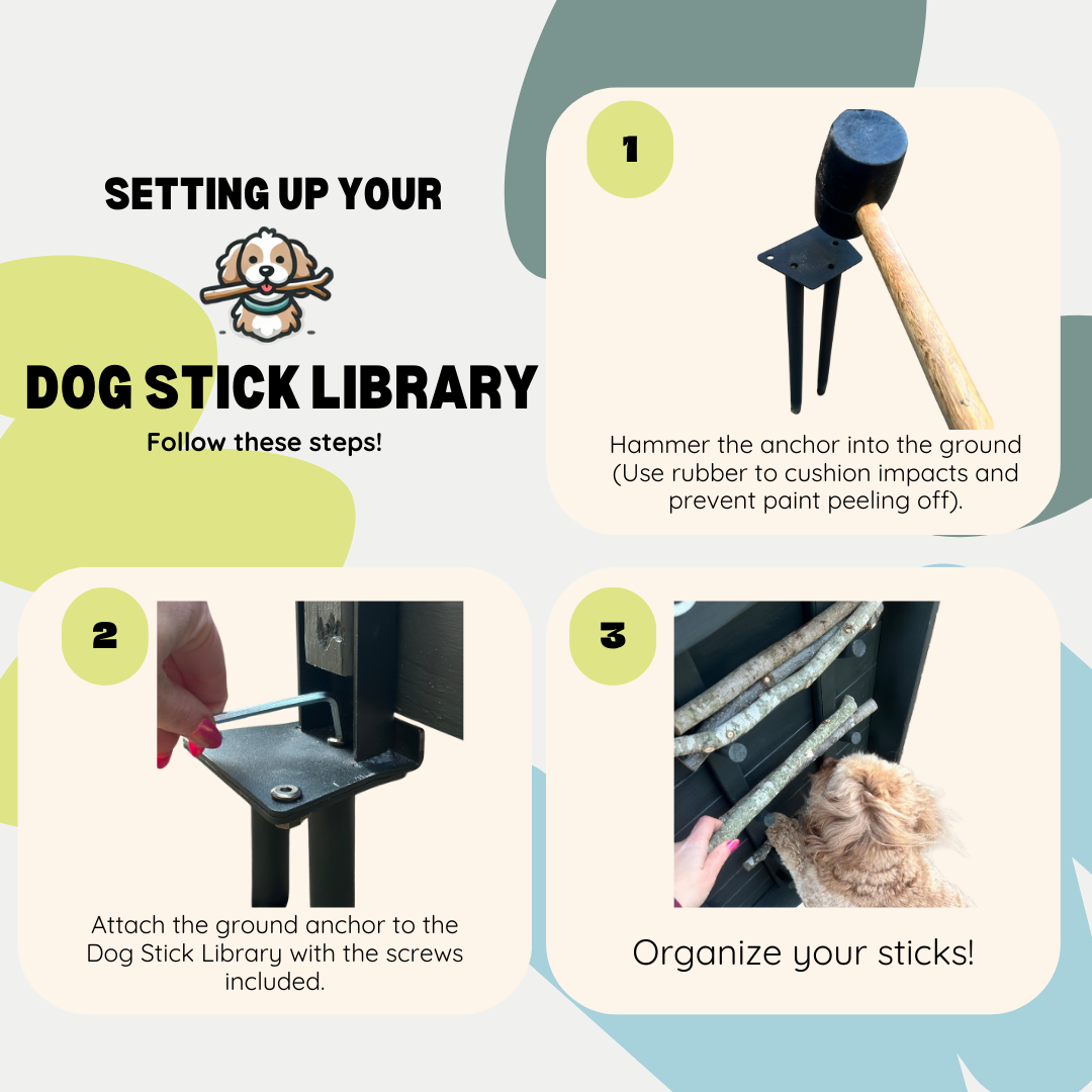 - Easy Installation: Designed for simple and hassle-free installation, this anchor includes simple tools needed for installation. No need to dig holes or pour concrete, you just hammer the anchor into the ground and use the included tools to secure the Dog Stick Library to the anchor.